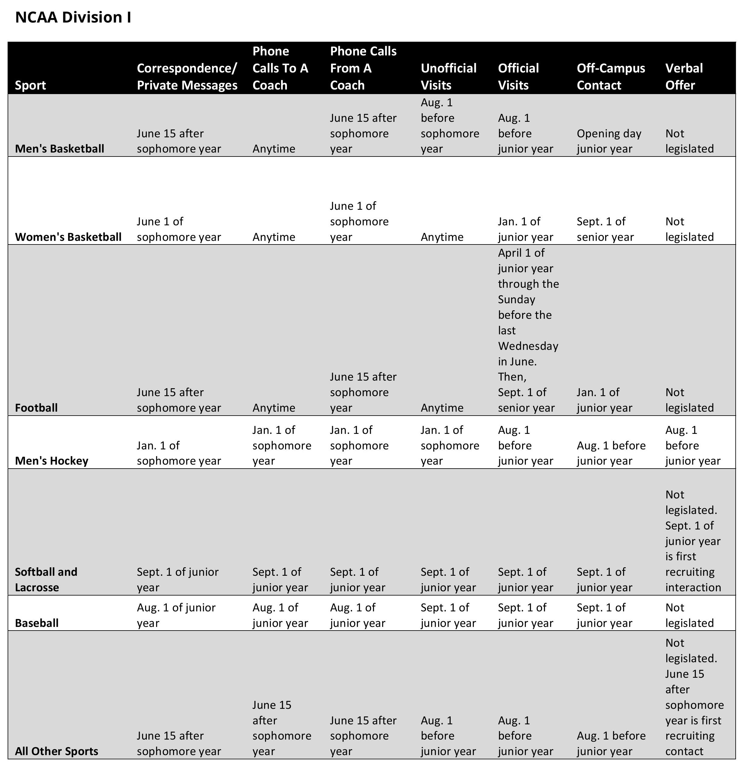 When and how colleges can contact you and watch you play varies by sport and by division. Click on the to the following link to find your sport’s recruiting calendar: